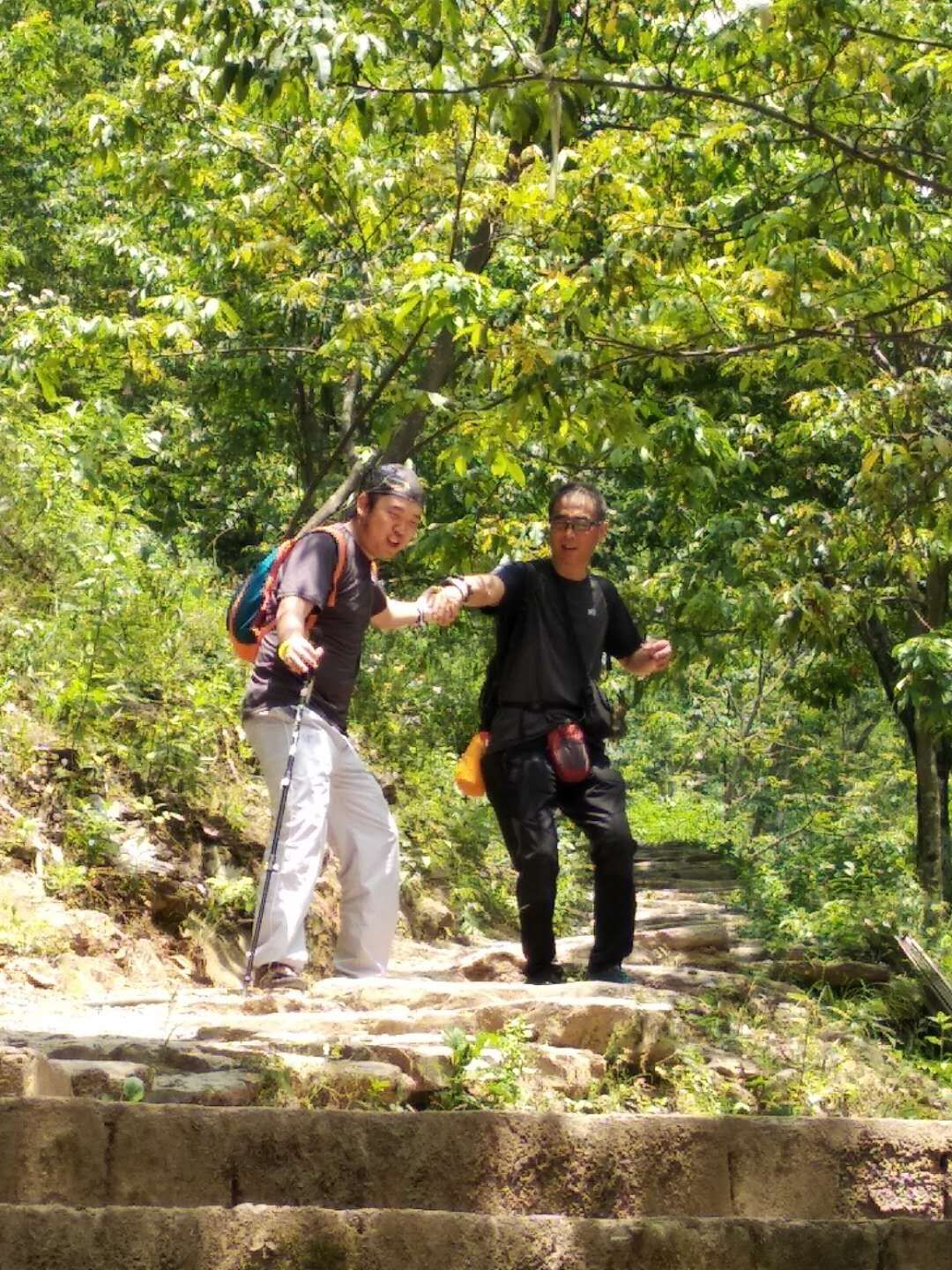 當天天氣晴朗,氣溫在32度左右,對整天待在辦公室的員工是個不小的考驗。初入古道,道路十分狹窄,很多地方只能單人通過,因為路不好走,小隊又分成兩個小組,方便互相照顧更方便順利前行,走在崎嶇的山間小路,可以想象曾經(jīng)穿越在這條山路上的商旅們是如何的艱辛。寂靜的遠山,巍峨而高遠,濃密的植被,綠意盎然的包圍著這條山路。在獎勵的誘惑下,隊員們一股作氣爬上了古道的至高點,海拔1050米的藍天凹,藍天凹是徽杭古道風景最美的地方,佇立凹口,極目四眺,周圍群山拜倒于腳下,遠處叢巒疊嶂,風起云涌,空山靜谷,懾人心魄。坐在藍天凹簡陋的茶棚下,吹著徐徐的山風,所有的疲憊瞬間被吹散,心立馬就靜了下來,白云蒼狗,遠山如黛,小組第一已不是大家的目標,只想好好的看看這沿途的風景。