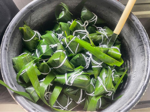 在經過一番嘗試和摸索后,大家逐漸掌握了包粽子的訣竅,動作愈發流暢自如。挑選出一片寬厚的粽葉,輕輕折疊成漏斗狀,然后投放適量糯米,再加入鮮美的餡料。隨后將粽葉包裹住糯米和餡料,用細線緊緊捆綁,不一會兒一個個尖尖的三角粽便成形了。